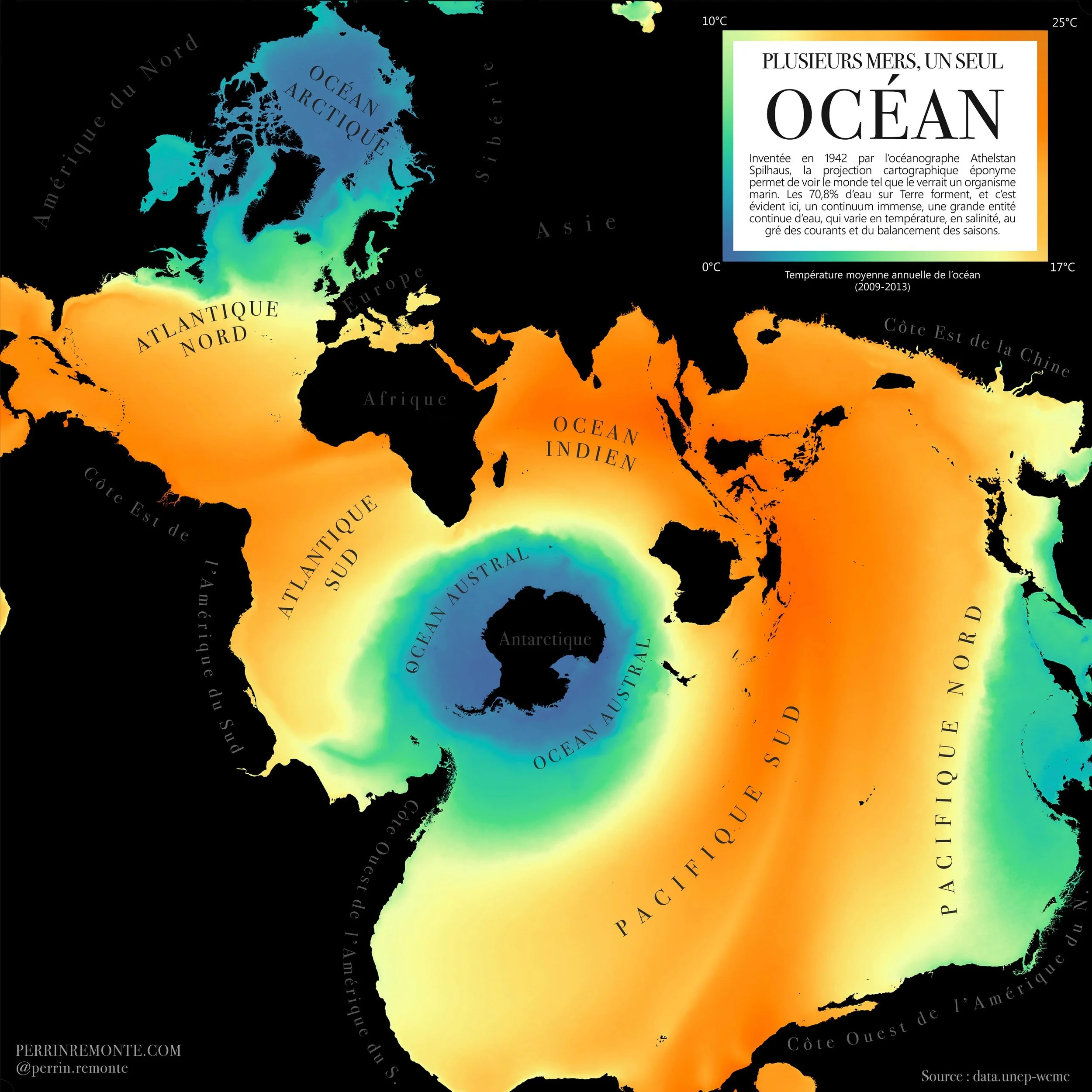Cette curiosité, ce petit bijou de lignes et de calculs est aussi mathématique que cartographique – car ne l'oublions pas, la cartographie, c'est avant tout des maths, auxquels nous cartographes modernes pouvons échapper grâce aux ordinateurs – et ce n'est pas un hasard si cette projection fut le fruit d'un brillant océanographe et géo-physicien sud africain et américain, Athelstan Spilhaus (1911-1998). Mise en carte, elle montre l'océan sans rupture et comme un vaste espace d'échanges : échanges maritimes, échanges culturels, échanges thermiques, échanges de biodiversité... Les terres, reléguées au second plan, sont largement déformées dans les coins de la carte : les rôles s'inversent ! Les terres deviennent des marges, des frontières. Je trouve amusant qu'en habitant au bord de l'eau, spécialement à Brest dans mon cas, considérer la mer comme le début de quelque chose, une ouverture, et non pas une fin (fin de la terre, fin de la France) semble presque naturel, et souhaitable ! Ici, je vous propose une donnée toute simple mais fondamentale : la température de surface qui prend forme, une forme rendue unique par la projection !