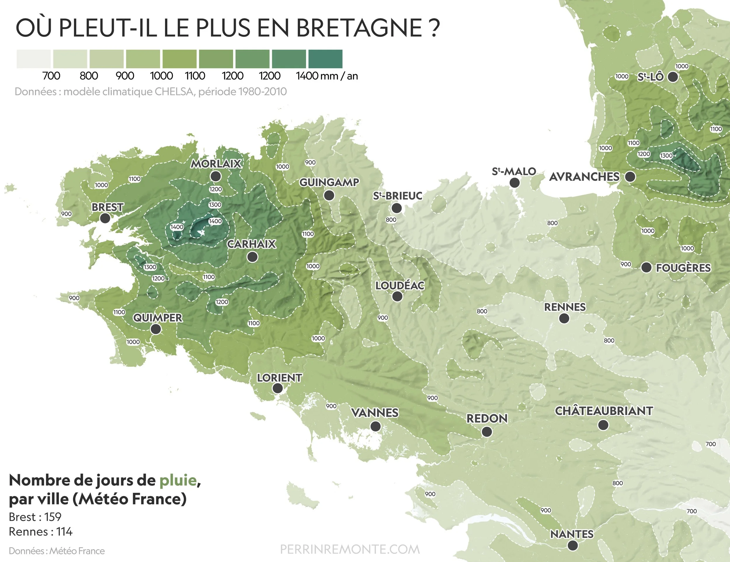J’ai mis en carte des données d'un modèle climatiques pour visualiser les pluies en Bretagne, en cumul annuel. Ça donne une idée grossière de nos futures forêts tempérées humides, leur étendue, leur répartition ou du moins, où elles se trouvaient dans le passé quand toute la région était boisée. Enfin, j'ai quand même oublié un paramètre dans ma liste : le temps. Beaucoup de temps.