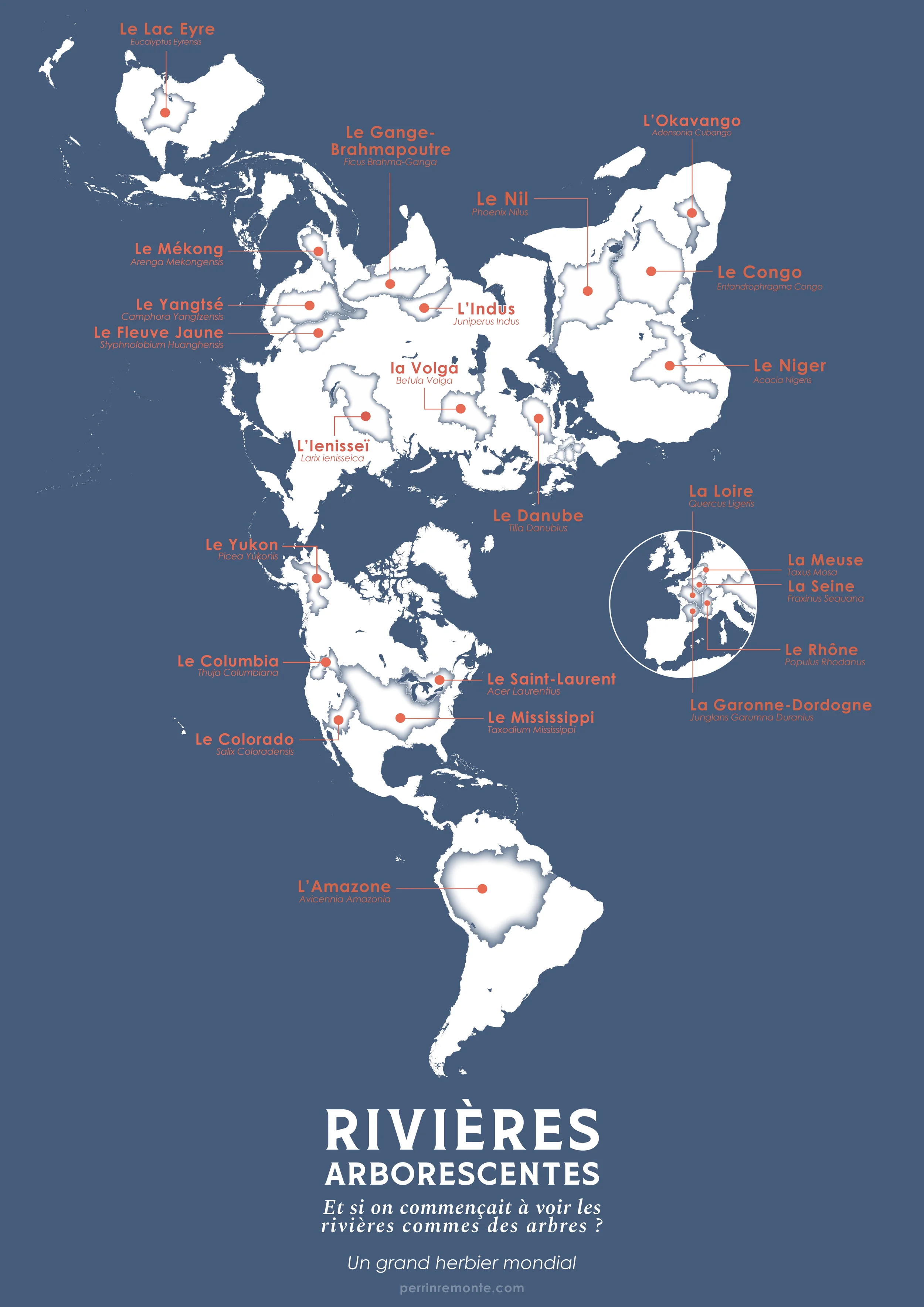 Bienvenue dans cette série de carte aux airs de portraits botaniques, cartes de quelques grands fleuves de notre planète, toutes orientées de manière à évoquer la silhouette d’un organisme végétal. A travers ces cartes, chacun des fleuves prend une apparence nouvelle, organique et arbustive, à la manière d’arbres d’espèces et profils variés ayant grandi dans un environnement tantôt venteux, tantôt humide, tantôt aride, certains n’atteignent pas la mer : ils n’ont pas de racines et d’autres sous très fins et élancées tandis que d’autres sont trapus et tordus… Mis sous cette forme, ces arbres-fleuves touchent les montagnes et les glaces du haut de leurs cimes tandis que leurs estuaires, leurs racines invisibles, plongent profondément dans les mers et océans du globe.